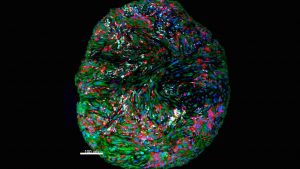 Imagen de microscopía multicolor de los componentes del sistema inmunitario tras el tratamiento de inmunoterapia (células tumorales, en verde; células mieloides, en rojo; y células linfocitarias, en blanco)