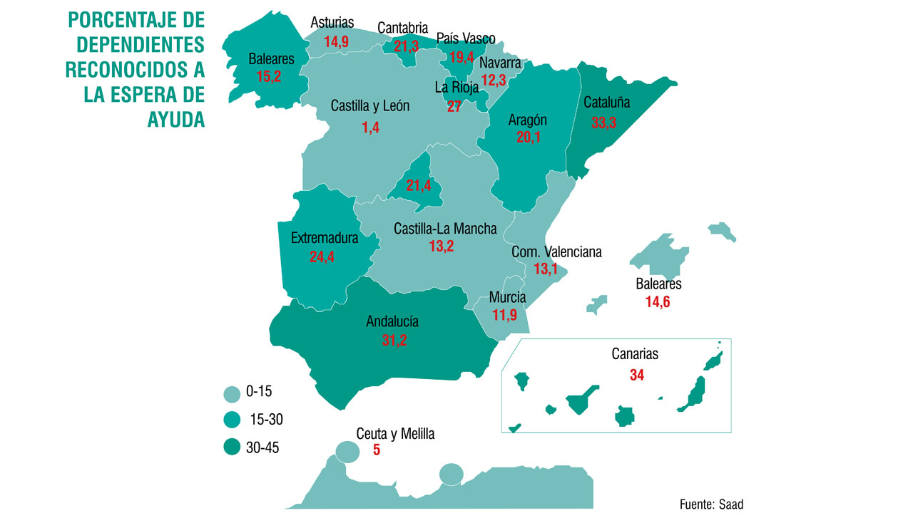En algunas comunidades como en Cataluña o Canarias casi el 35 por ciento de los dependientes sufren demoras, mientras que en otras comunidades como Casilla y León, las demoras afectan a sólo el 1 por ciento de los dependientes reconocidos, pese a que esta autonomía, además, tiene un porcentaje de población dependiente sobre su población total mucho más elevado, fruto de su mayor envejecimiento.