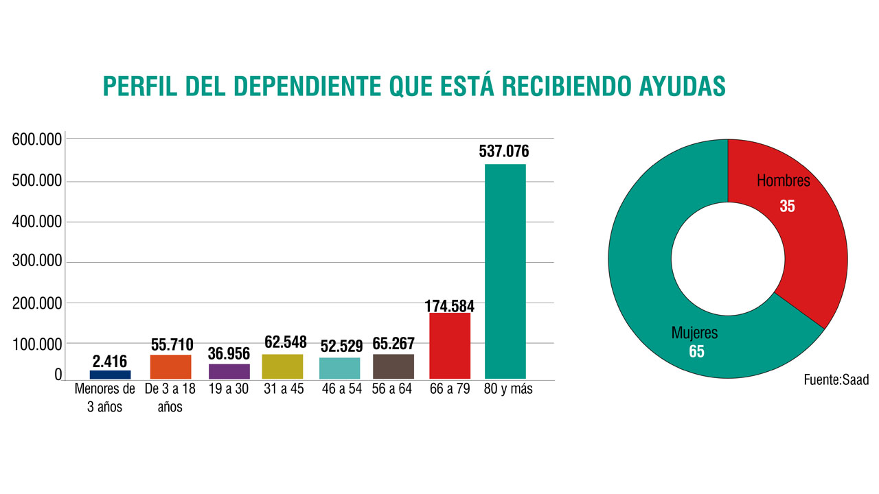 Por otra parte, las nuevas cifras ministeriales trazan el perfil del dependiente que está recibiendo ayudas. Se trata en un 65 por ciento de casos de mujeres y está protagonizado por los mayores de 80 años, que representan el 54 por ciento del total de dependientes. Con todo, dependencia y envejecimiento están lejos de ser sinónimos: uno de cada cuatro dependientes es menor de 65 años.