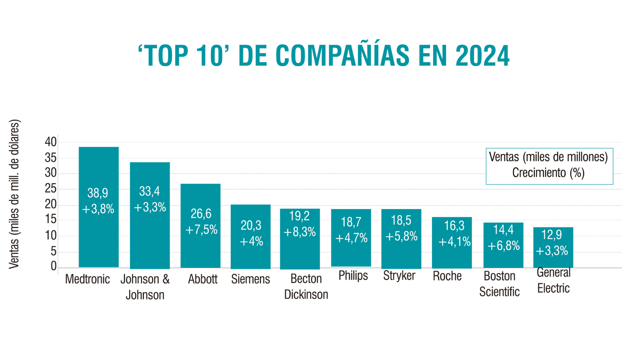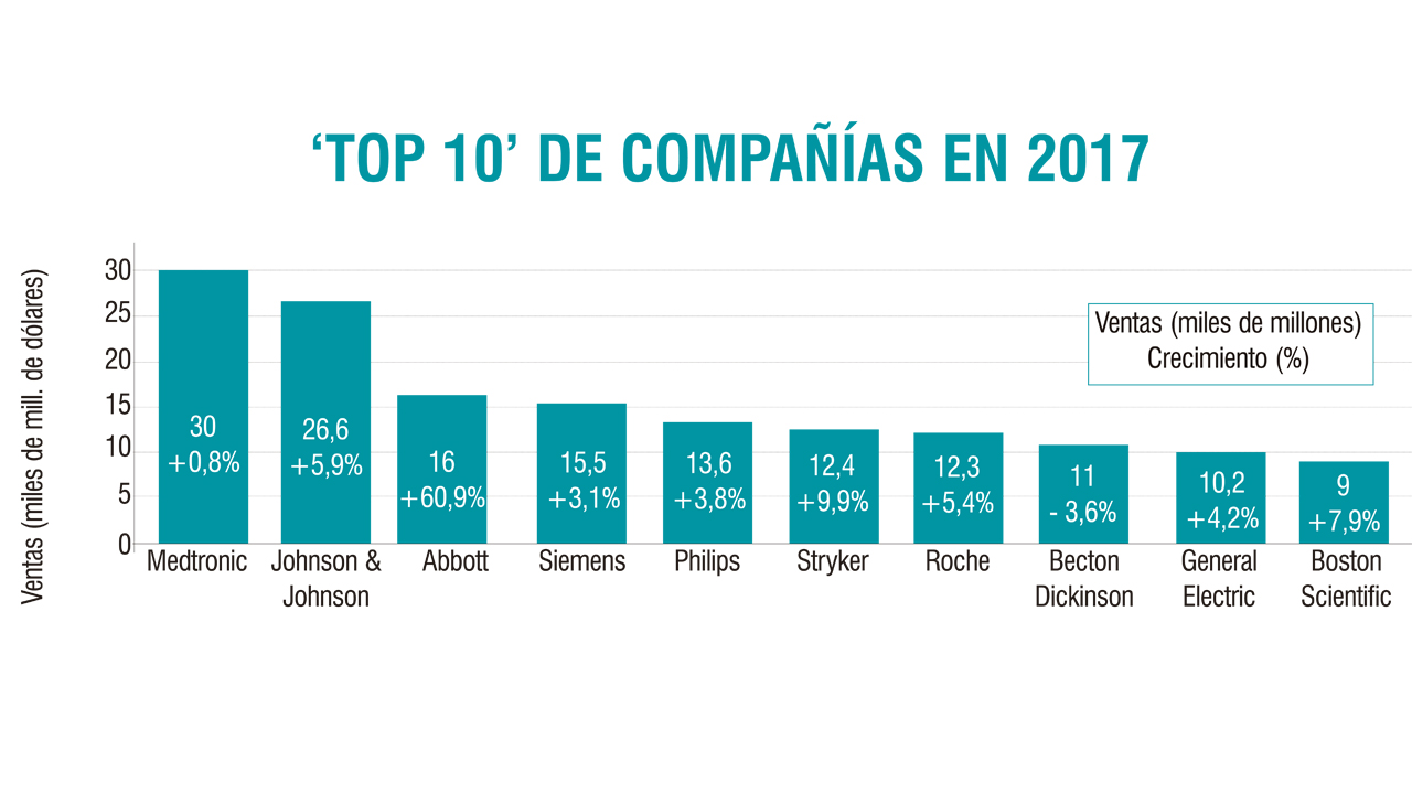 Medtronic, pese a registrar la menor tasa de crecimiento entre las veinte primeras compañías, se mantuvo líder en 2017 con unas ventas globales de 30.000 millones de dólares y una cuota de mercado del 7,4. También se espera que sea la primera compañía del mundo en 2024, con ventas estimadas en los 38.900 millones pero con menos cuota (6,5 por ciento). Destaca el crecimiento en los ingresos de Abbott en 2017 (60,9 por ciento) como resultado de la adquisición de St. Jude, que fortaleció su posición en cardiología. Para 2024 esta compra y la de Alere, junto con la venta de su unidad de negocio de oftalmología, le mantedrá en la tercera posición del ranking con unas ventas estimadas en más de 26.000 millones.