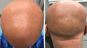 Después de siete meses de tratamiento con dupilumab, creció una cantidad significativa de pelo pigmentado. Debido a un cambio en el seguro médico, tuvo que interrumpir el tratamiento durante un período de dos meses, durante los cuales notó la caída del cabello recién nacido. Pero después de que pudiera reanudar el tratamiento en abril de 2018, el crecimiento capilar se reanudó y continuó.